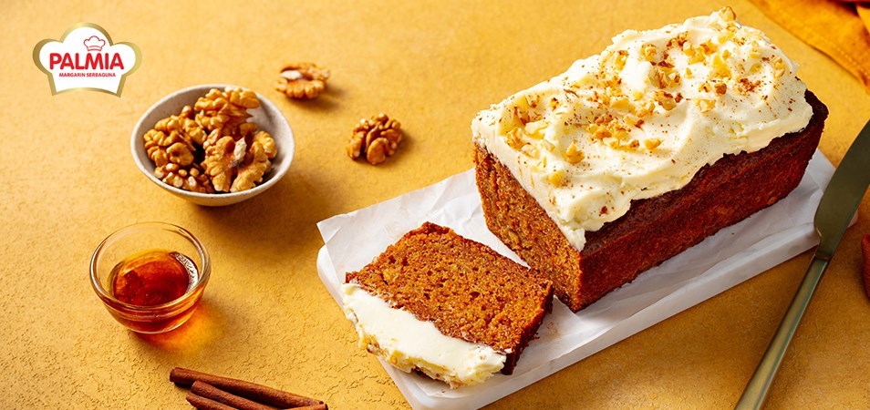 Jika biasanya carrot cake dibuat dalam bentuk cake bulat, Moms juga bisa membuatnya dalam bentuk loaf cake yang lebih praktis dipotong dan disajikan. Teksturnya tetap moist, dengan tambahan butter cream cheese di atasnya yang memberikan rasa gurih dan creamy.